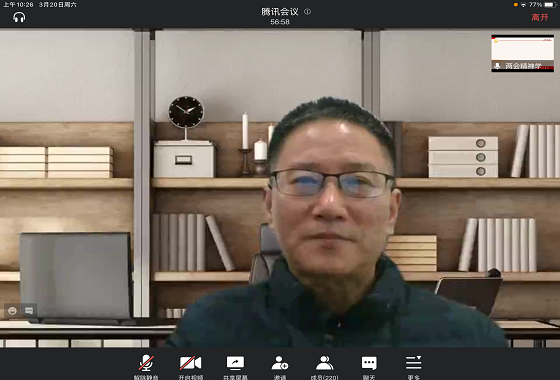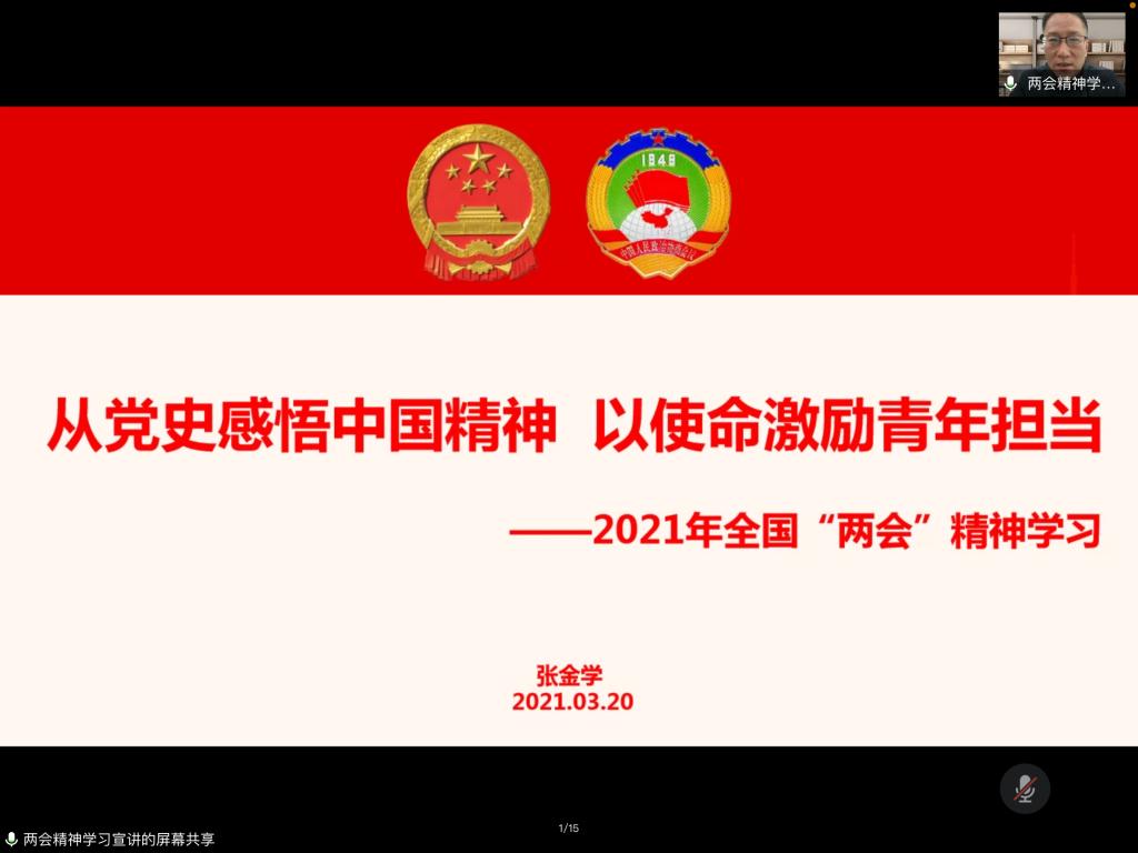张学金通过此次全国人民代表大会的议程以及中华人民共和国国民经济和社会发展第十四个五年规划和2035年远景目标纲要,引出了此次讲座学习的主题,并通过中国精神的内涵与深远意义、中国精神和党史学习的辩证关系、中国精神与大学生思政教育三个方面来阐述了“学习两会精神,接续使命担当”的主题。最后,张金学提出,从党的十九届五中全会开始到十三届四次人大会议和全国政协十三届四次会议,我们站在两个一百年奋斗目标的历史交汇点上,蓝图已经绘就,规划已经做出,对于广大同学来讲,要为全面建成社会主义现代化国家注入强大的思想和行动力量,希望大家了解会议精神,把自己在各方面学习到的内容一并融会贯通,担负起自己的使命。