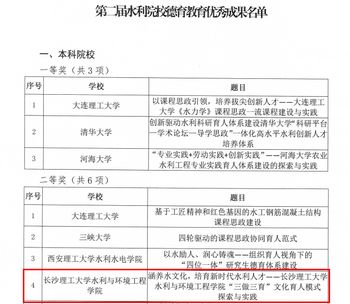 水利与环境工程学院‘三做三育’文化育人模式探索与实践”文化育人成果获评本科院校组二等奖。此次评选全国共有清华大学、河海大学、大连理工大学等46所水利相关院校报送75项成果材料,经汇总初审、组织专家网络评审和公示等程序,评选出水利德育教育优秀成果本科院校组一等奖3项,二等奖6项,三等奖9项。
