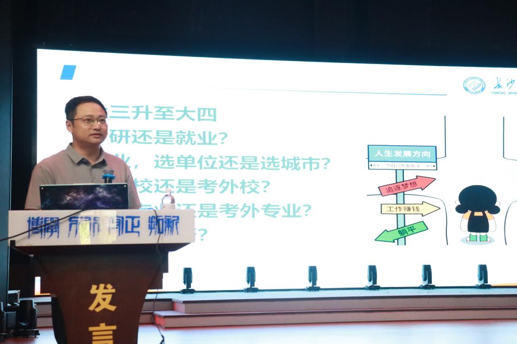 会上,陈杰首先对当前就业形势进行了深入分析。他指出,2026届全国高校毕业生人数持续增加,湖南省内就业市场竞争日趋激烈。当前就业市场呈现出明显的结构性矛盾:一方面,人工智能、大数据、新能源等新兴产业人才需求旺盛;另一方面,传统专业面临“僧多粥少”的困境。以港航专业为例,中交三航局、中建港航局等央企的招聘规模有所缩减,且对学历要求不断提高,硕士比例普遍达到40%-70%。他建议同学们通过考研深造提升竞争力,并介绍了学院2025届考研取得的优异成绩。