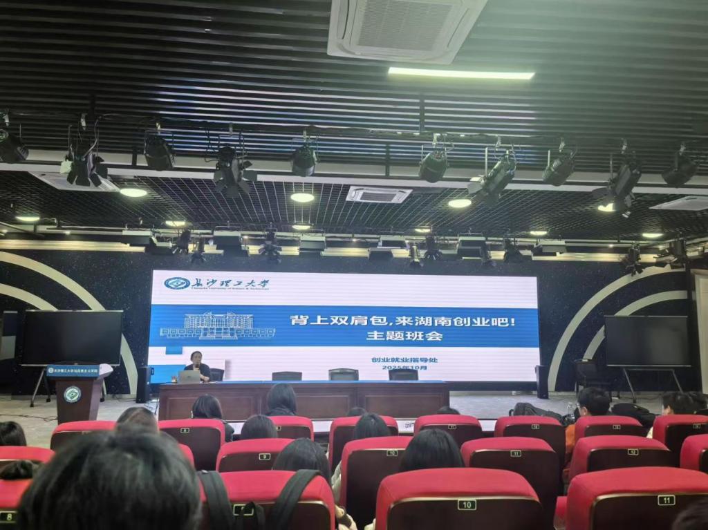 10月30日下午,马克思主义学院在云塘校区文科楼B300报告厅举行“背上双肩包,来湖南创业吧!”主题班会。班会由学院学工办主任曾蓓主持,2025级全体研究生参加。