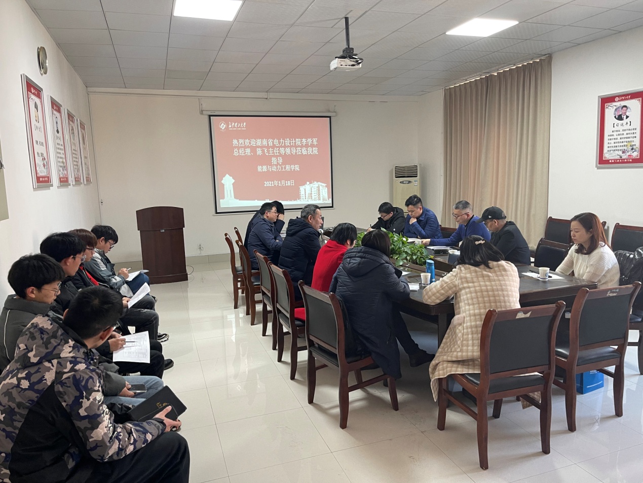 1月18日下午,中能建湖南省电力设计院有限公司副总工程师李学军、科技质量环保部主任陈飞等一行来我院开展合作交流座谈会,我院党委书记成华、副院长鄢晓忠、何建军及教师代表参加座谈。