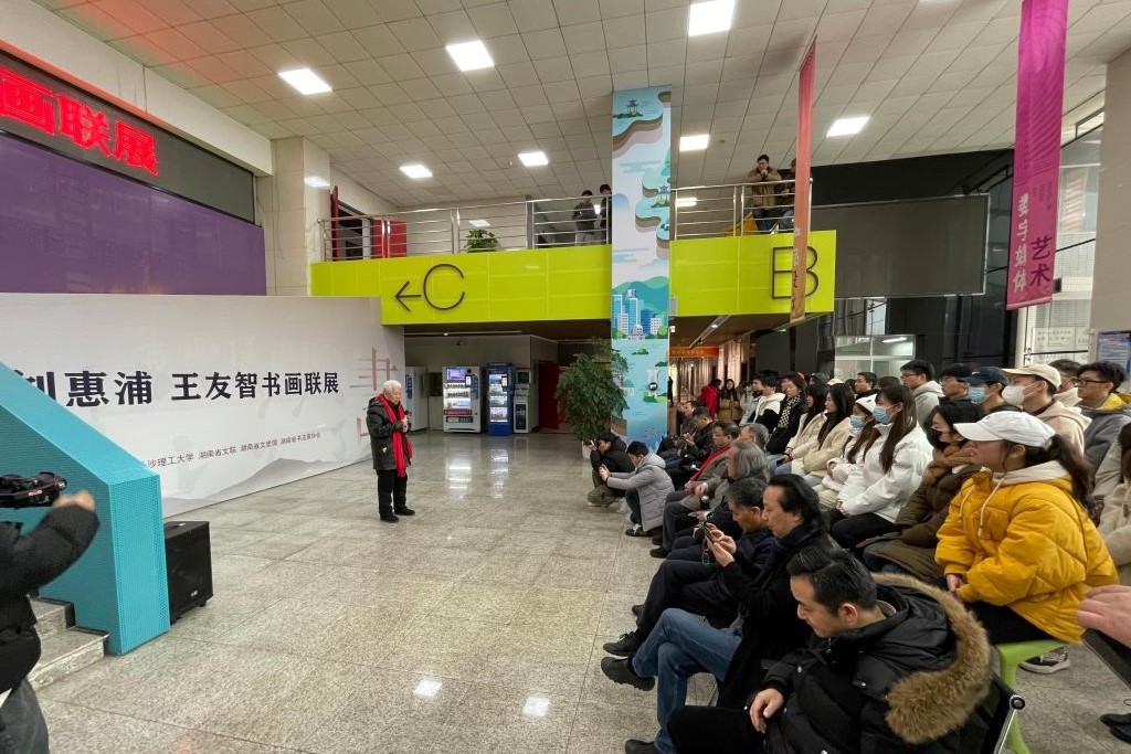 12月31日上午,设计艺术学院翰墨飘香,群贤毕至,刘惠浦、王友智书画联展在设计艺术学院展厅开幕。中交路桥建设有限公司党委副书记陈宁,副总经理张庆华;湖南省财政厅教科文处处长刘东楚,湖南省文联副主席、湖南省画院院长旷小津,湖南省文史研究馆副馆长陈伏球;副校长谈传生,宣传部副部长喻玲,设计艺术学院党委书记李伟,设计艺术学院院长王健以及设计艺术学院班子成员出席开幕式。