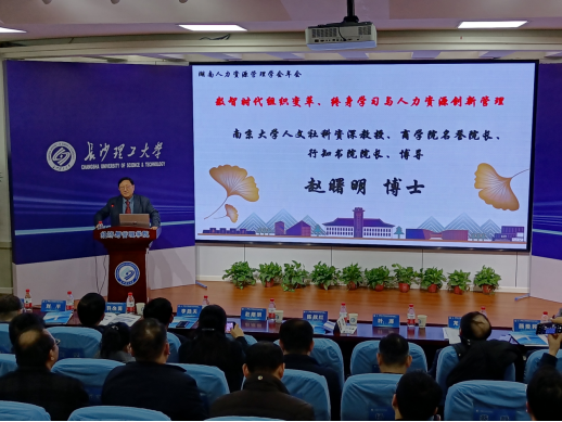 经济与管理学院副院长(主持工作)彭新宇教授,南华大学经济管理与法学院院长、湖南省人力资源管理学会李玉琼教授主持。南京大学商学院赵曙明教授为大会作了主题为“数智时代组织变革、终身学习与人力资源创新管理”的精彩报告。赵教授提出数智时代雇佣关系的变化,指出后疫情时代的组织变革趋势,构建了高校、企业、社会为动能与保障的关于人的终身学习的理论框架,并提出了企业的人力资源管理创新策略。