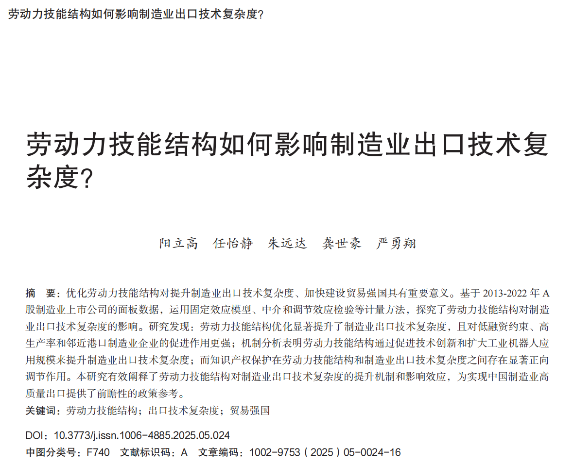该论文聚焦加快建设贸易强国、推动制造业高质量发展的重大战略需求,深入探讨了优化劳动力技能结构对于提升制造业出口技术复杂度的关键作用。基于2013—2022年A股制造业上市公司的面板数据,运用固定效应模型、中介和调节效应检验等计量方法,探究了劳动力技能结构对制造业出口技术复杂度的影响。研究发现:劳动力技能结构优化显著提升了制造业出口技术复杂度,且通过了稳健性和内生性检验;机制分析表明劳动力技能结构通过促进技术创新和扩大工业机器人应用规模来提升制造业出口技术复杂度;而知识产权保护在劳动力技能结构和制造业出口技术复杂度之间存在显著正向调节作用;劳动力技能结构对制造业出口技术复杂度提升的正向影响呈现显著异质性,对于低融资约束、高生产率和距离港口近的制造业企业来说,其正相关关系更强。本研究有效阐释了劳动力技能结构对制造业出口技术复杂度的提升机制和影响效应,为实现中国制造业高质量出口提供了前瞻性的理论参考。