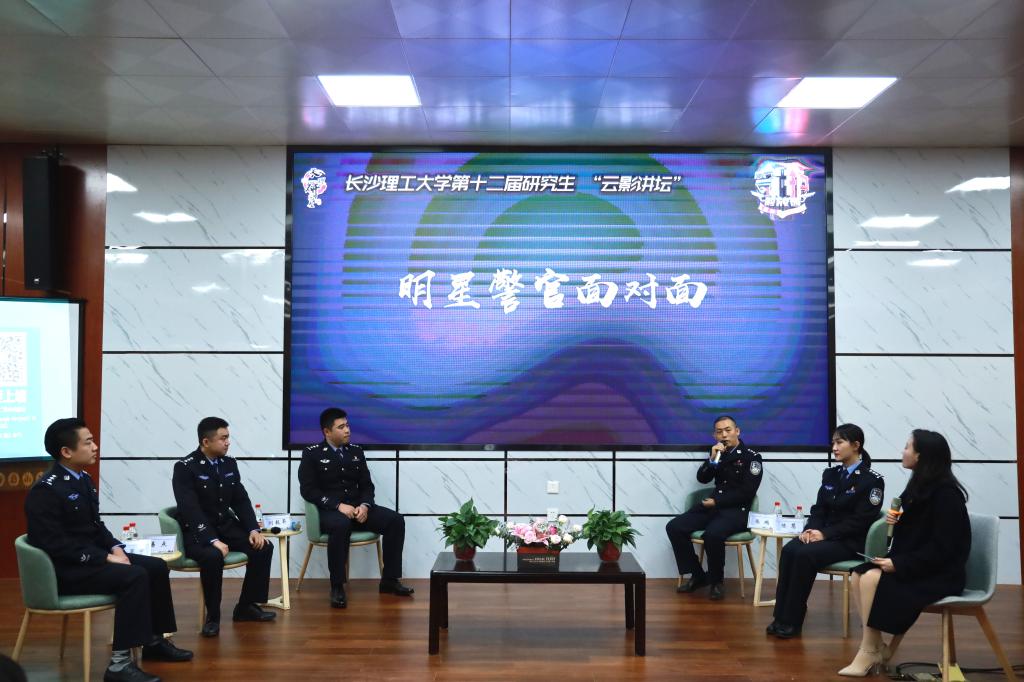 金盆岭校区四教报告厅内座无虚席,一场别开生面的普法活动正在热烈地进行中。应校研究生院邀请,热播视频《守护解放西》中的“明星警官”——张鹏、刘毅昇、刘星宇、易点、陈慧等一行专程来校出席第十二届研究生云影讲坛专题普法交流活动,200多名师生参加了现场活动,这也是该节目首场与高校学生的线下互动活动。