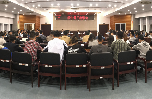 校党委书记付宏渊讲话 副校长谈传生讲话 学生骨干座谈会现场 10月25日晚,我校学生骨干座谈会在一办九楼会议室召开。校党委书记付宏渊听取了学生干部代表们的发言,勉励大家要争当三个表率,引领优良校风学风。座…